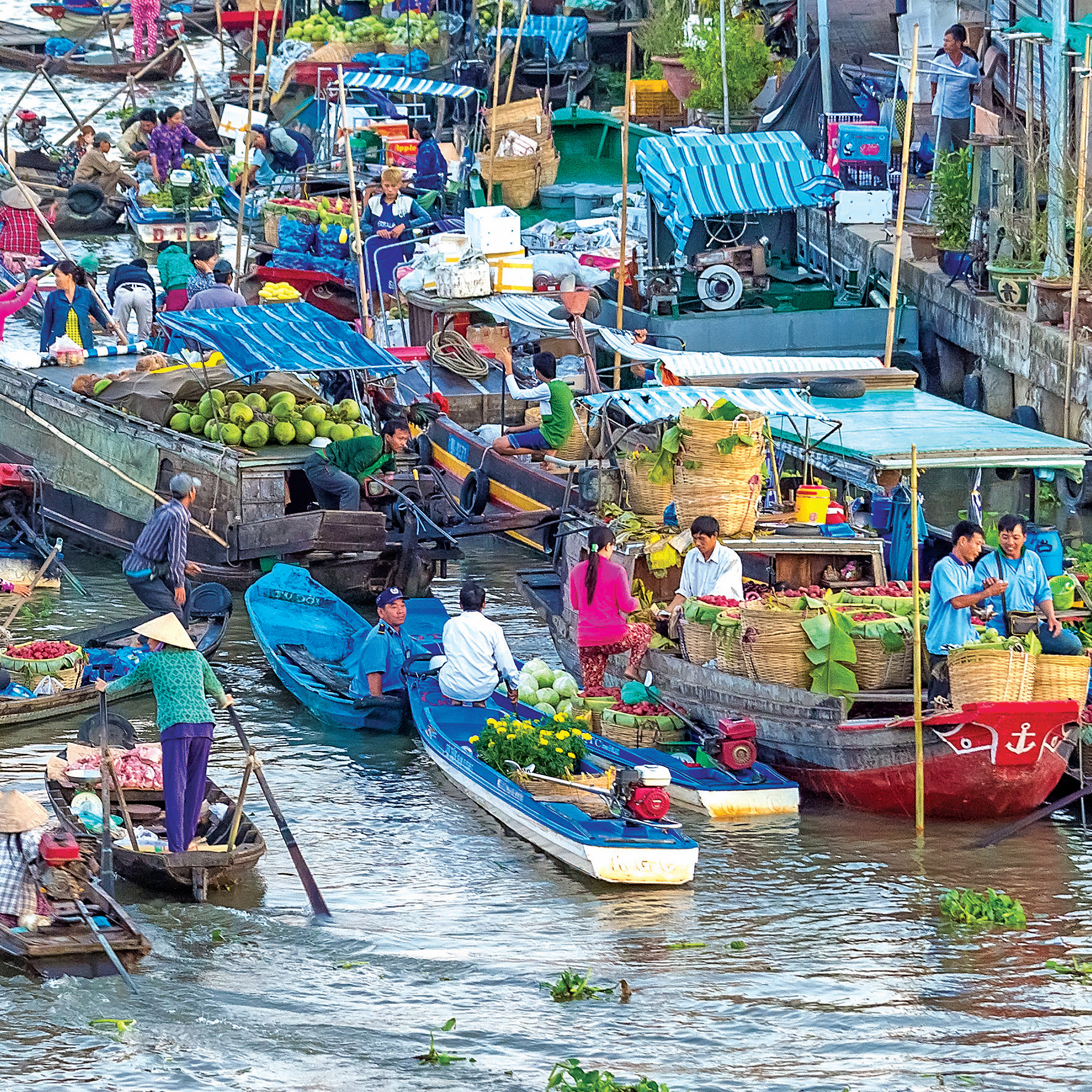 Unsere Wahl: Bleiben Sie mindestens eine Nacht in einer Stadt im Mekong-Delta, um den morgendlichen schwimmenden Markt zu besuchen, eine Radtour oder ein Ruderboot für einen Tagesausflug in den Obst- und Blumengarten zu unternehmen.